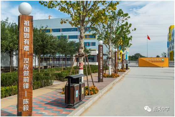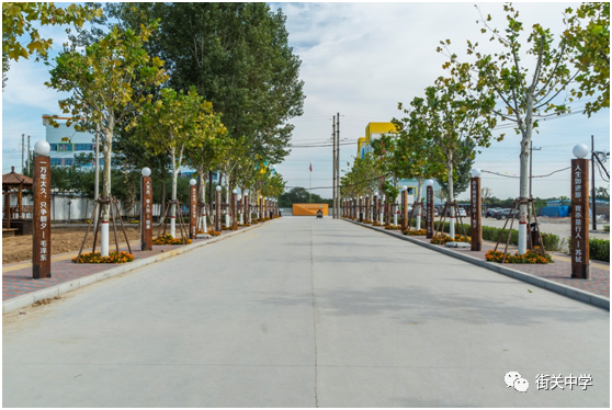 來到街關(guān)中學(xué),首先映入眼簾的是一個半圓形的花池,花池中四棵粗大的古木站立,每棵古木需兩人合圍才可環(huán)抱,古木兩側(cè)分別寫有“禮、義、貌、仁、良、溫、讓、智”八個繁體字和對各個字的釋義,傳承中華博大文化;花池中間一棵10余米高的古木斜指云天,一座5、6米高的鐵書立于旁側(cè),鐵書上鏤空雕刻武強(qiáng)年華代表作“六子爭頭,上書“衡水街關(guān)中學(xué)”幾個大字,寓意街關(guān)中學(xué)用浩瀚的知識、多元化的教育培育棟梁之才。