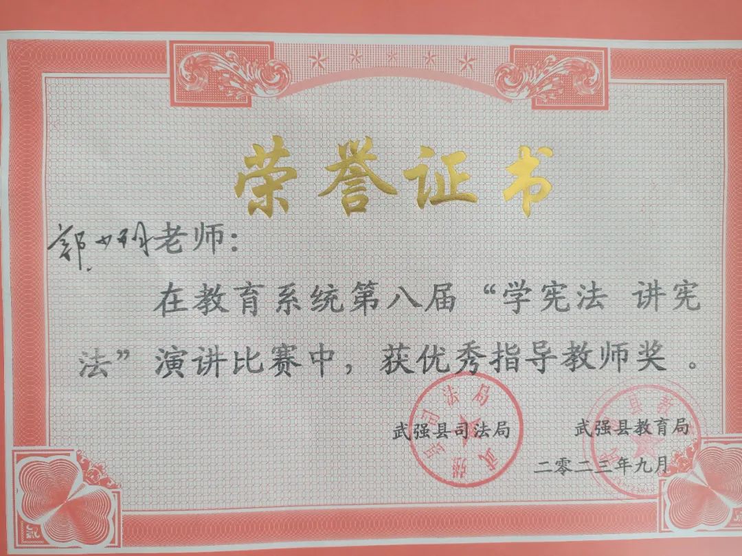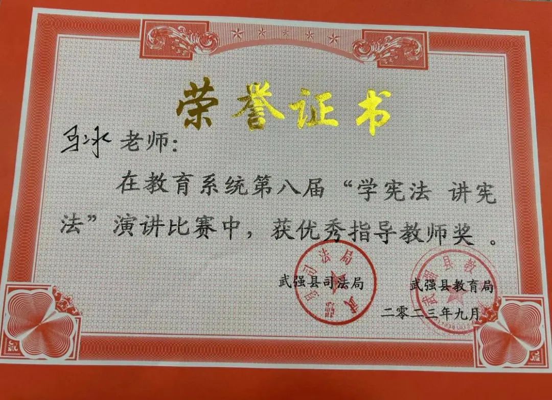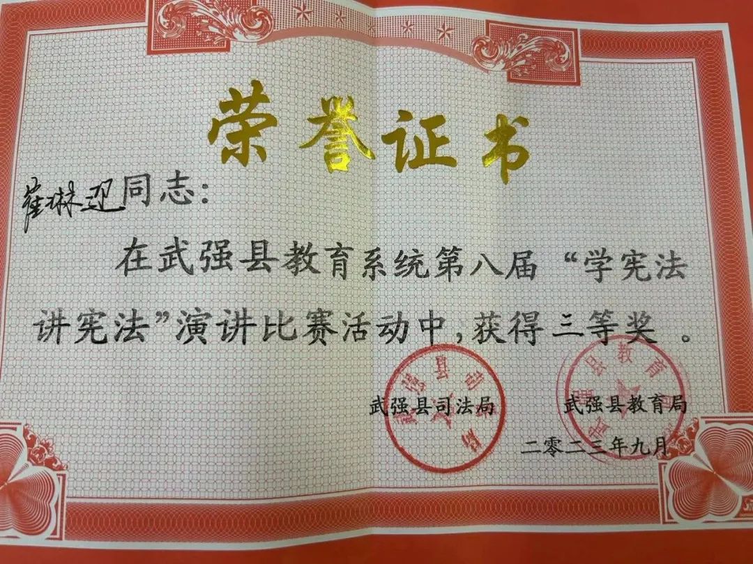 為全面學(xué)習(xí)貫徹黨的二十大精神,深入學(xué)習(xí)貫徹習(xí)近平法治思想,推動(dòng)青少年憲法宣傳教育常態(tài)化和“學(xué)憲法 講憲法”活動(dòng)的深入開展,武強(qiáng)縣教育局、武強(qiáng)縣司法局舉辦2023年教育系統(tǒng)第八屆“學(xué)憲法、講憲法”演講比賽,經(jīng)過激烈的角逐我校初中部學(xué)子于騰皓獲得二等獎(jiǎng),學(xué)子高若嫣、教師崔琳迎獲得三等獎(jiǎng),馬冰、郭少陽(yáng)教師獲得*指導(dǎo)獎(jiǎng),為街關(guān)中學(xué)建校69周年暨衡水街關(guān)中學(xué)建校3周年校慶添光增彩。