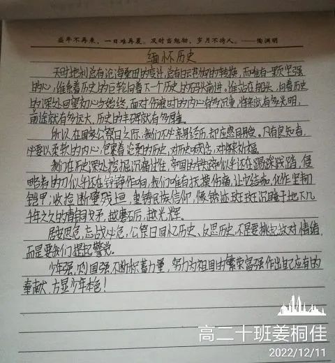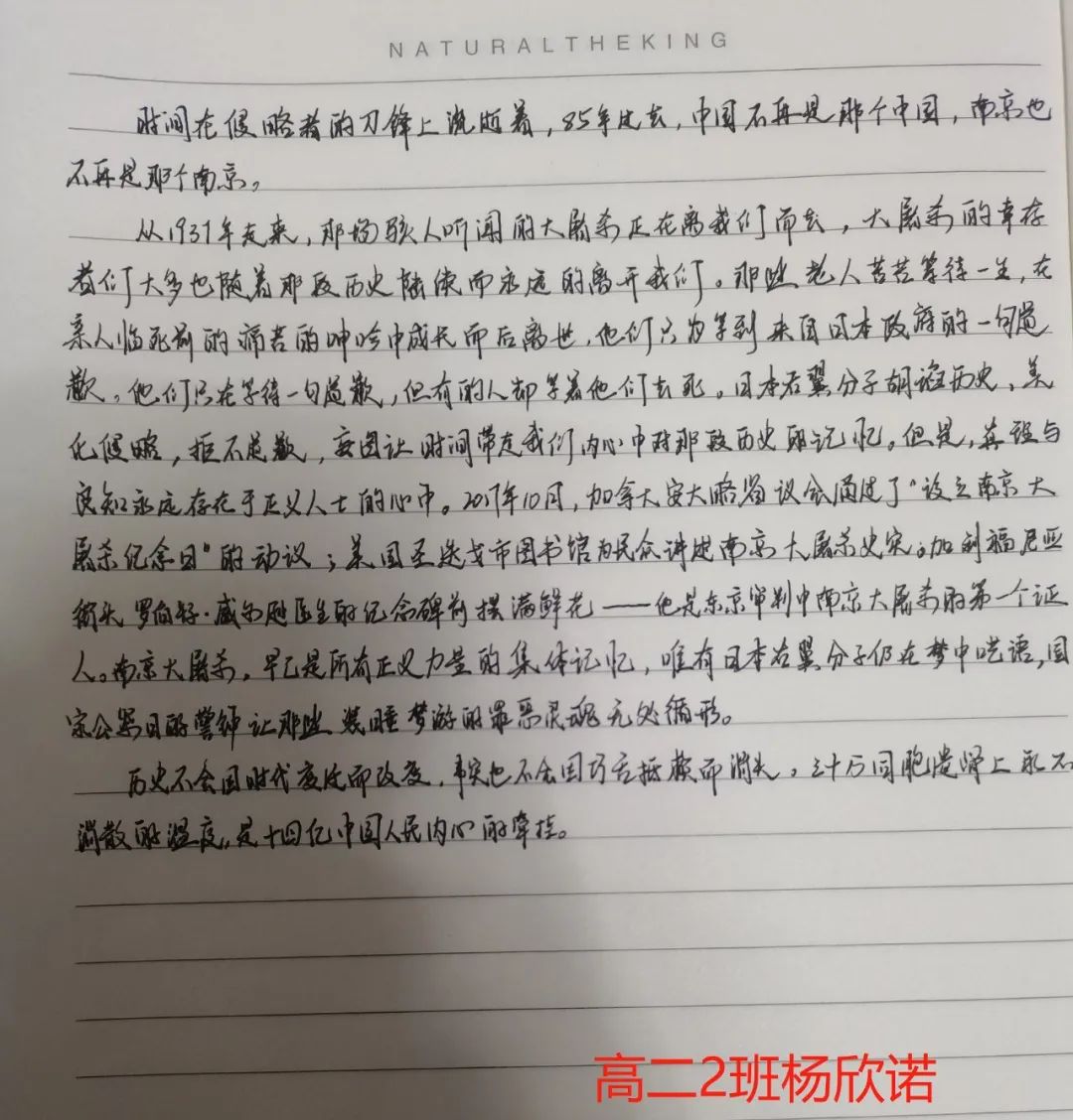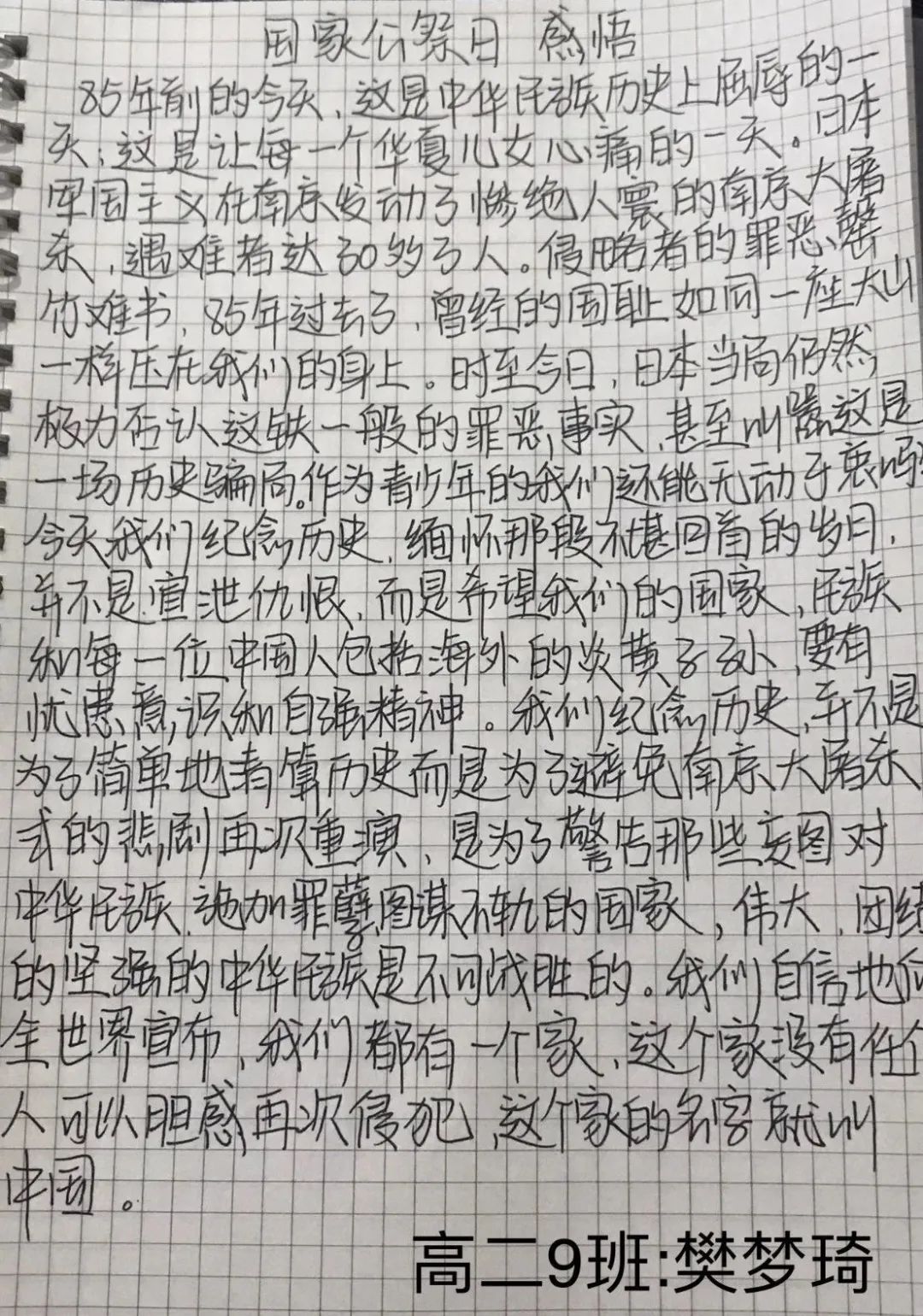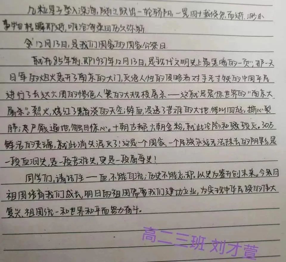 課后,同學(xué)們紛紛寫出了觀看視頻的感受,深切緬懷大屠殺無辜死難者,深切祭奠為抗戰(zhàn)勝利獻(xiàn)出生命的革命先烈和民族英雄。
