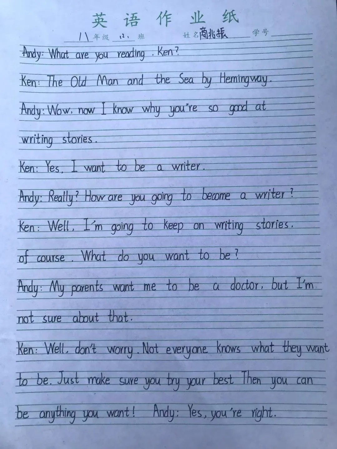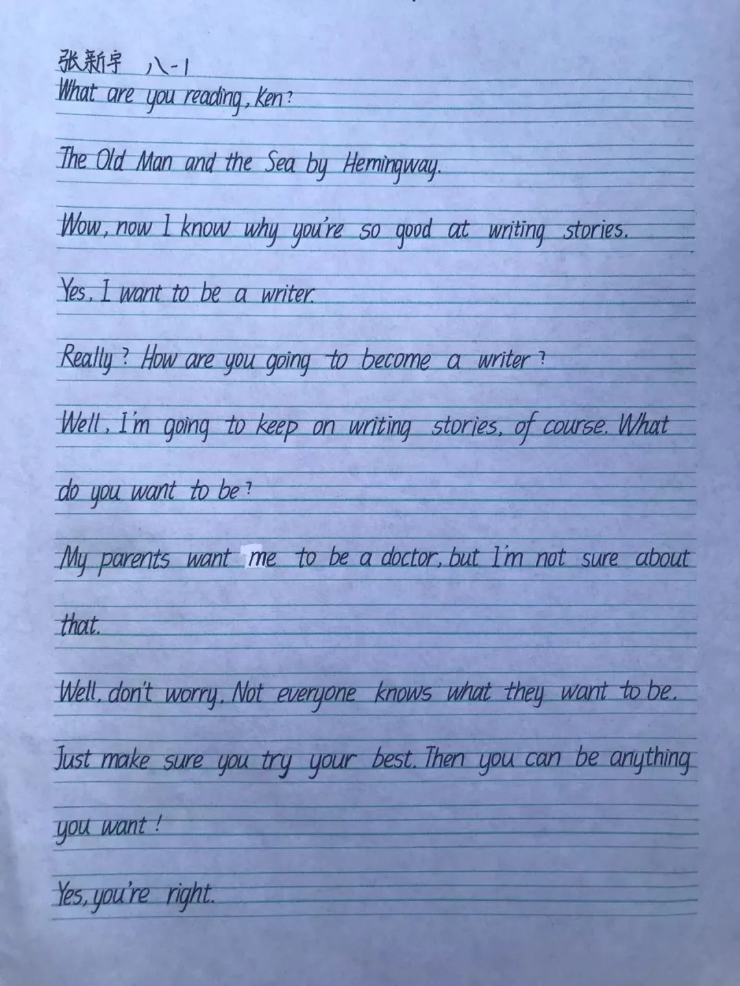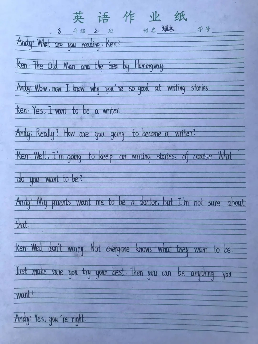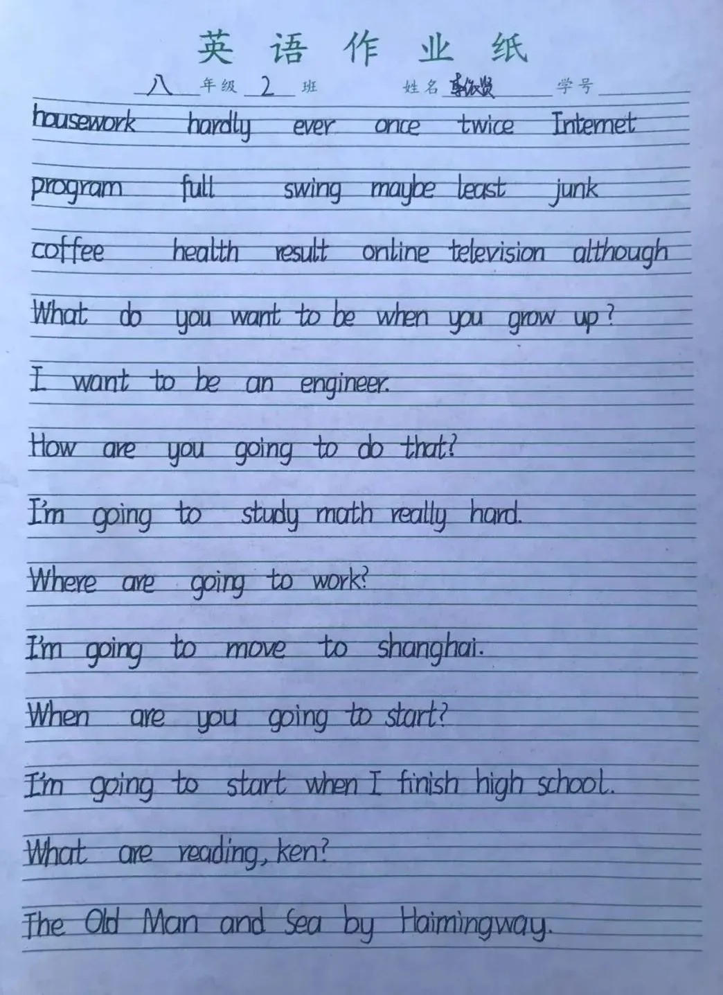 學(xué)生課堂古人云:“起初是我們?cè)斐闪?xí)慣,后來(lái)是習(xí)慣造成我們?!傲己玫臅鴮懥?xí)慣不僅反映了一個(gè)人端正的學(xué)習(xí)態(tài)度,更是一種良好的學(xué)習(xí)習(xí)慣。”好的字跡不僅讓人賞心悅目,還可以增強(qiáng)個(gè)人修養(yǎng)和審美情趣。書寫是初中英語(yǔ)學(xué)習(xí)的一項(xiàng)重要內(nèi)容。